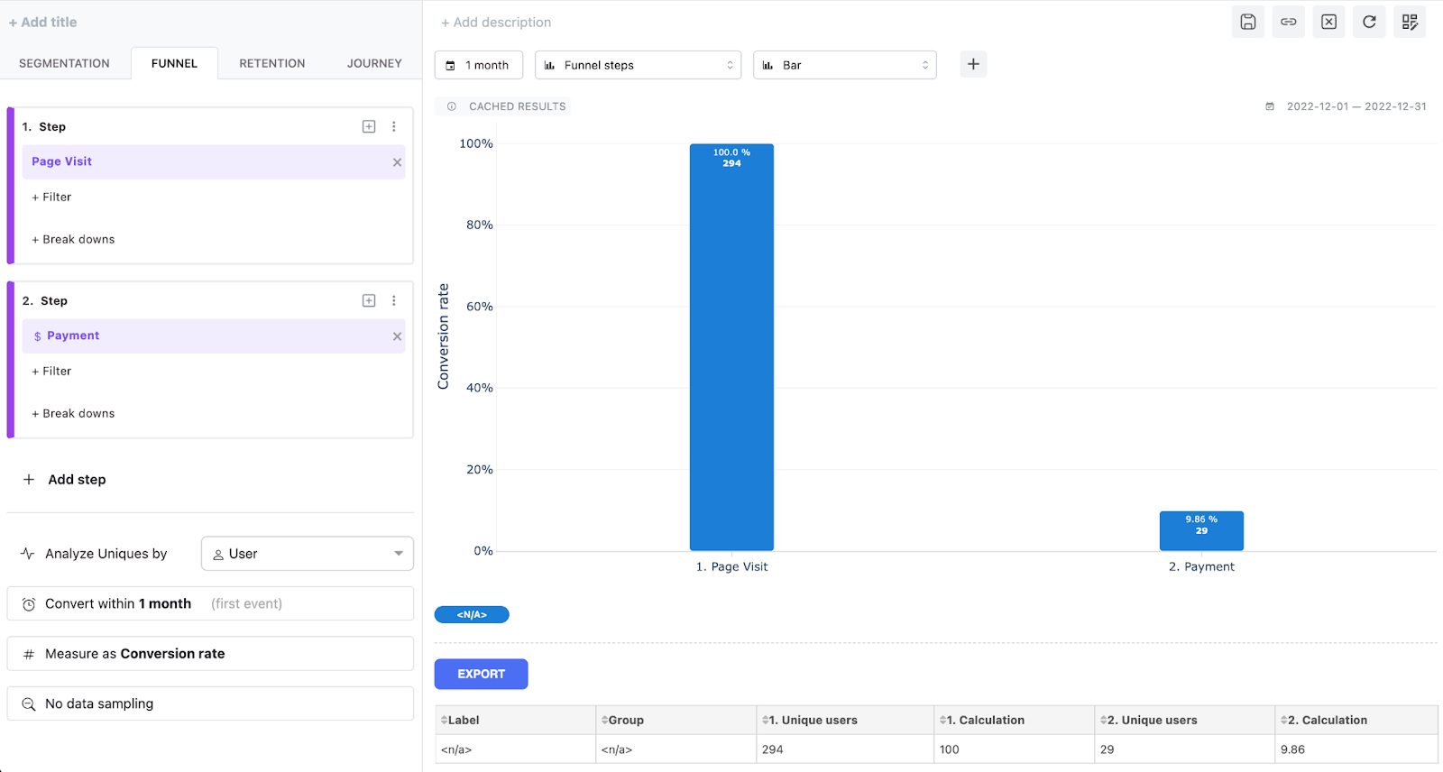 - Select a 1-month conversion window at the funnel configuration dialog.
