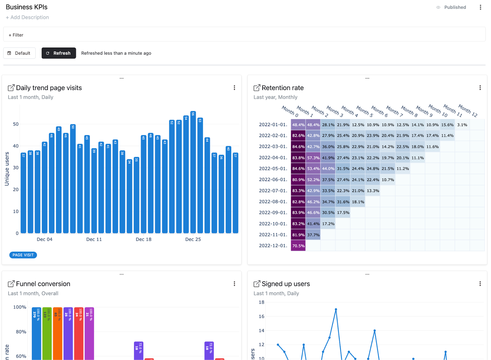 Dashboards enable automatic refreshes on the charts. With this feature, you and your colleagues can track your KPIs over time.