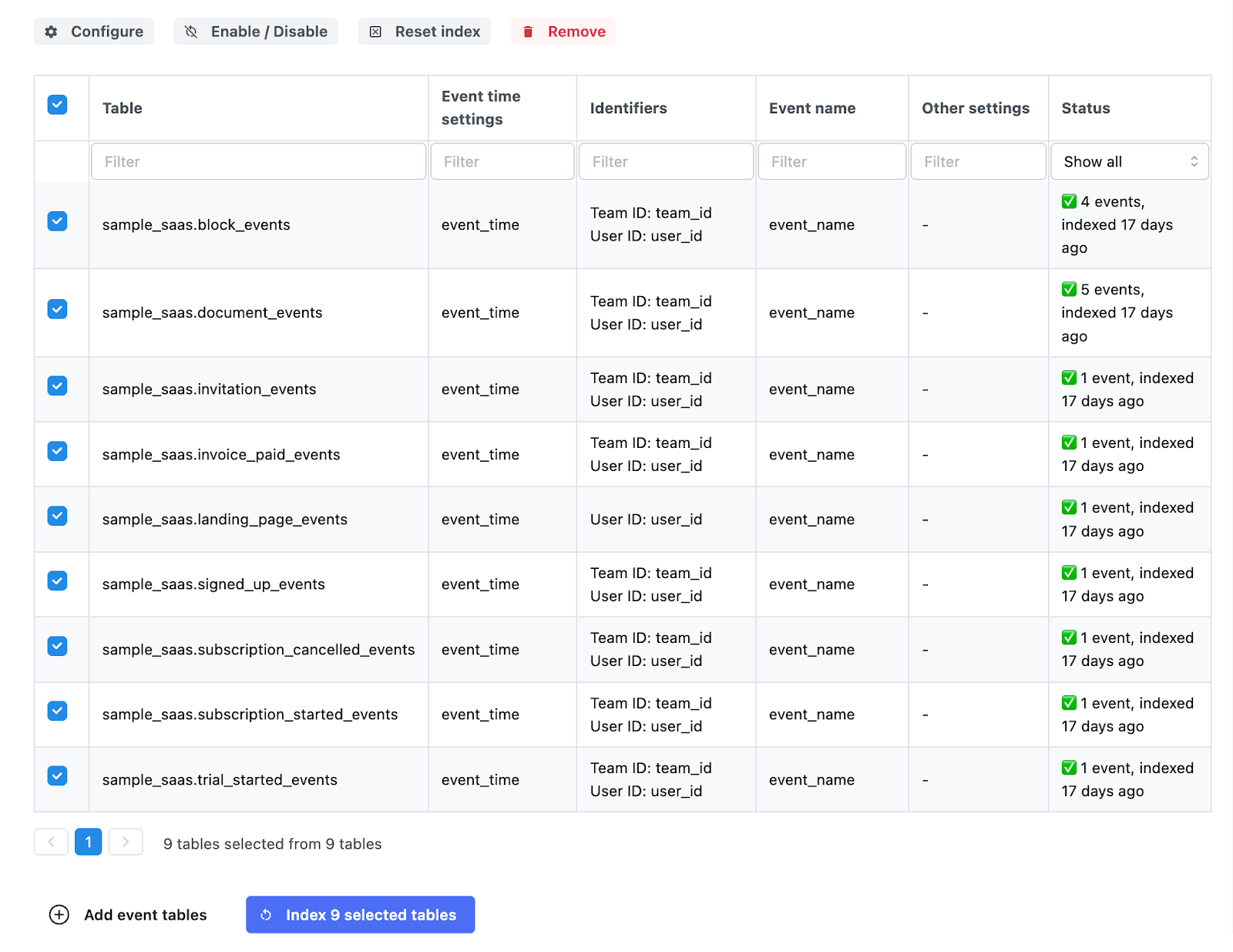 Once the user adds the event tables, they are indexed to create the events and properties catalog. This process may take a few minutes, but is crucial for the application's usability.