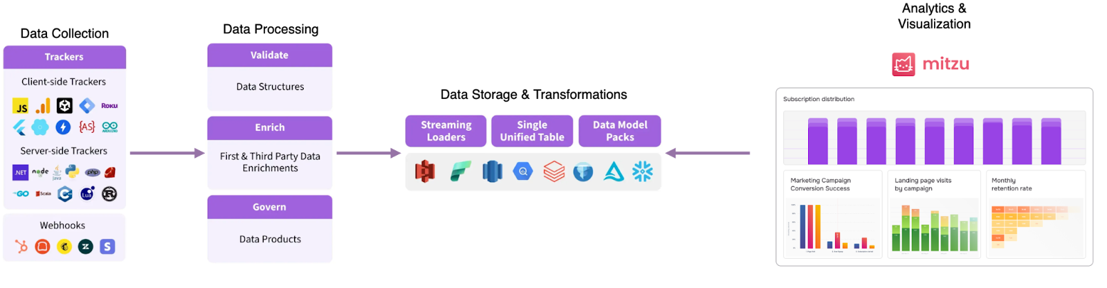 - Analytics & Visualization Mitzu is an independent software that connects to the data warehouse or data lake where Snowplow stores the raw or transformed data. Mitzu enables self-service product & marketing analytics over Snowplow datasets.