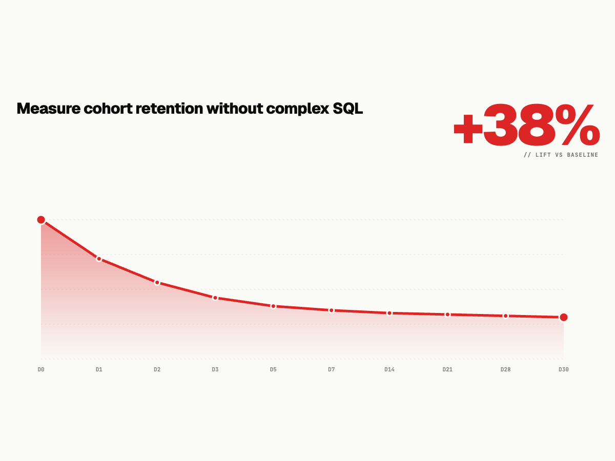 It makes calculating cohort retention rates in just seconds - just select your cohort group and the timeframe you want to analyze. This help you to identify trends and patterns into user behavior without the headache of manual data crunching, writing SQLs or copying the data from the outsourced warehouse tool.