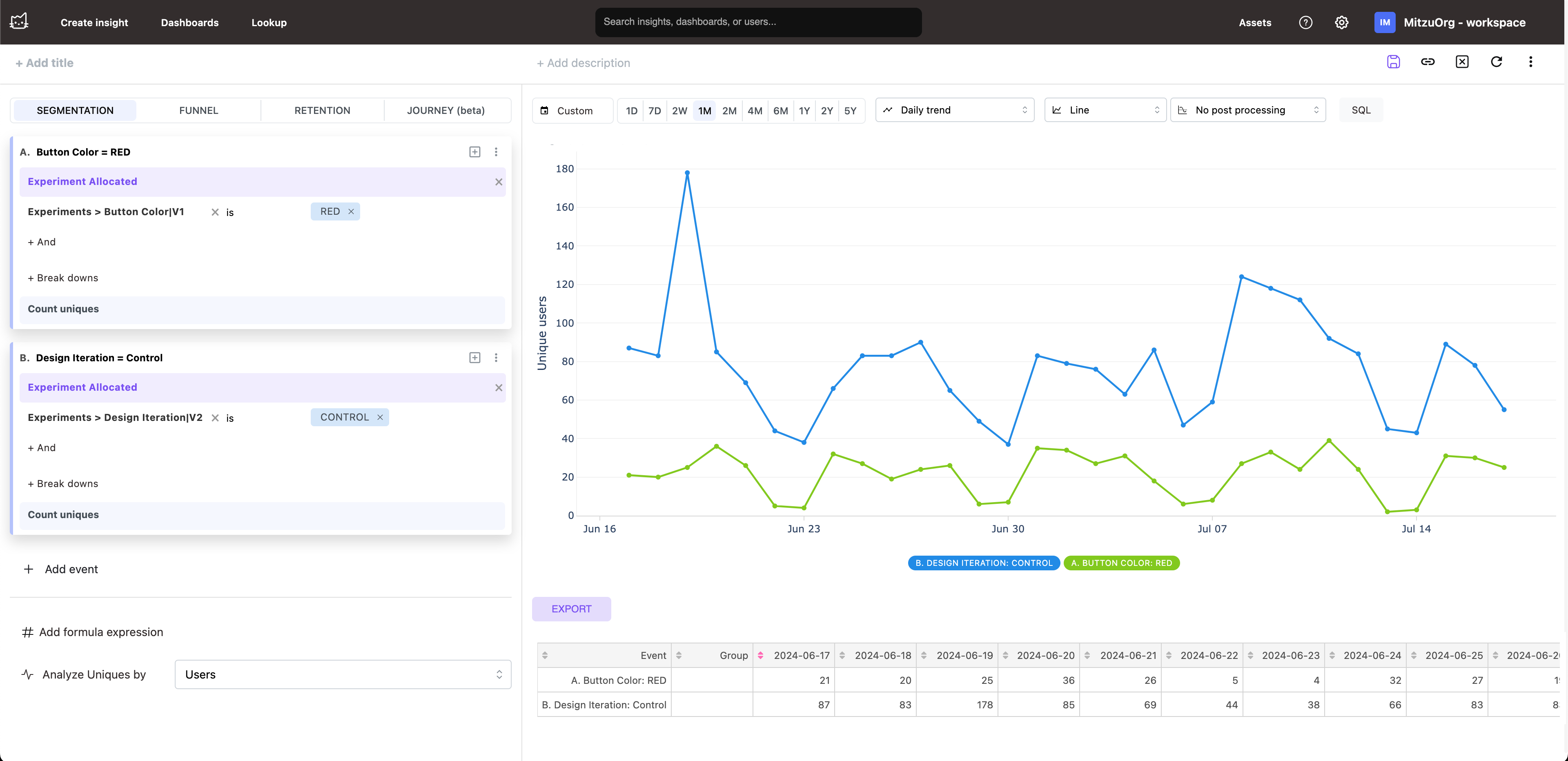 - You can easily group by the variants of a single experiment. This will allow you to compare the variants of the experiments.