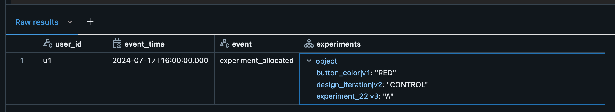 { "user_id": "u1", "event_time": "2024-07-17 16:00:00", "event": "experiments_allocated", "experiments": { "button_color|v1": "RED", "design_iteration|v2": "CONTROL", "experiment_22|v3": "A", } }