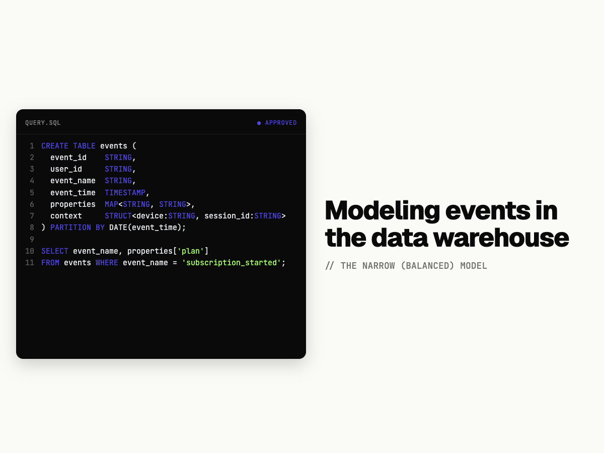 In this post, I will cover 3 data models of how you can model events in the data warehouse and what factors you should consider before deciding on the model that will fit your use-case.All three of these models we have seen while integrating Mitzu with customer data warehouses.
