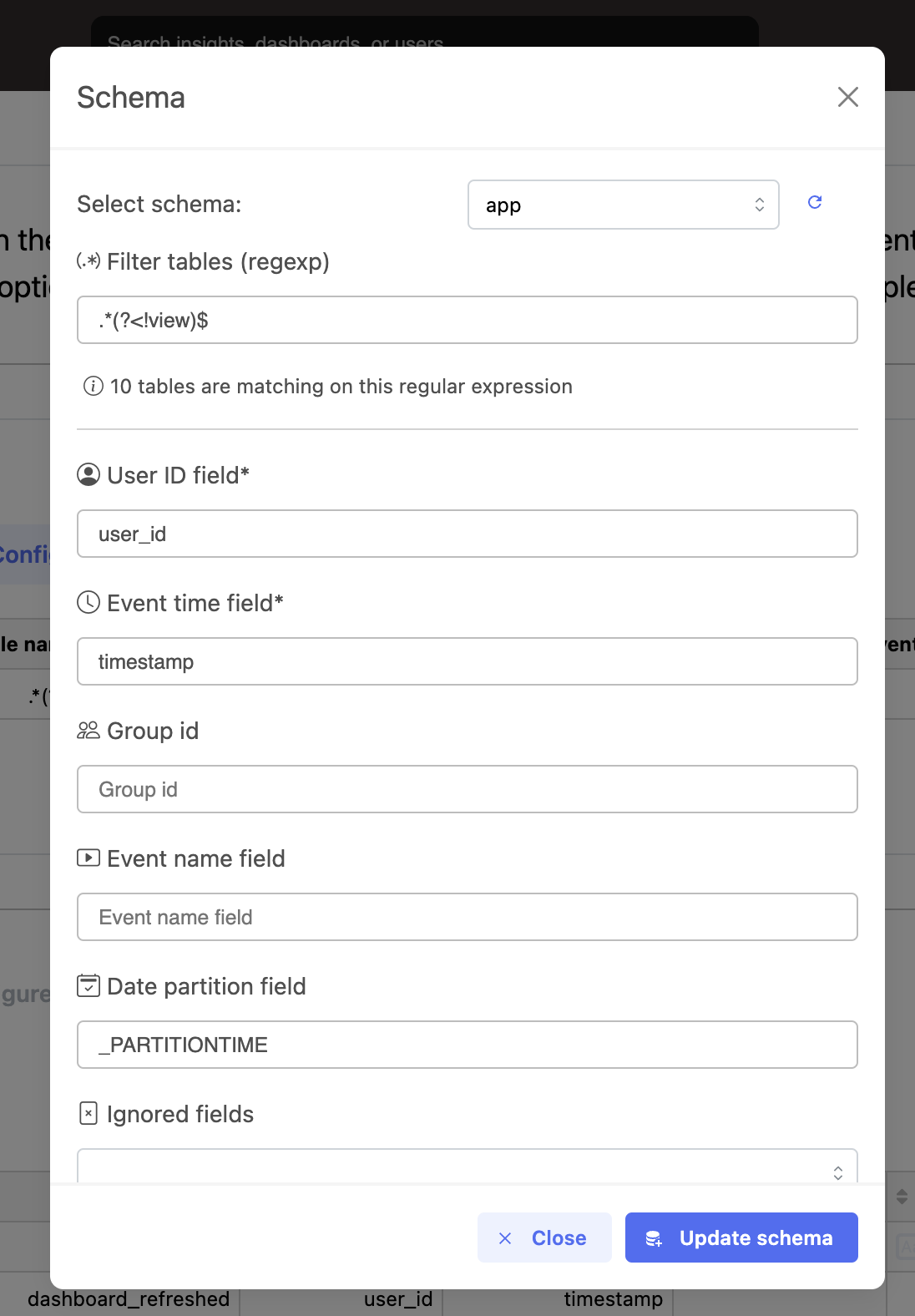Once your tables are listed and you have saved and updated your event catalog, you can head to the "insights" page.