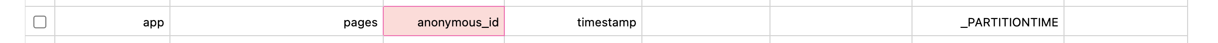 - _PARTITIONTIME - this is specific to BigQuery only, this column should be used as the date partition field. Based on this column BigQuery can optimize product analytics queries.