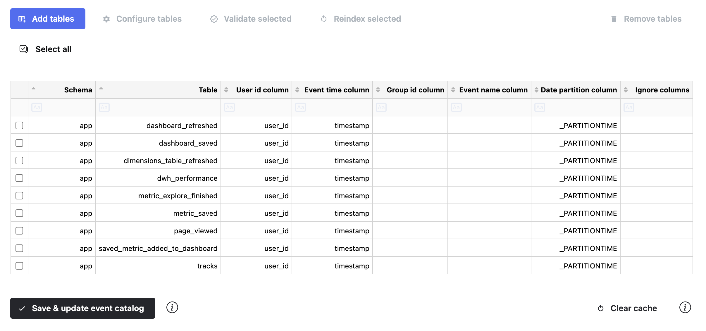 Next, click Save & update event catalog. This will ensure that all tables are represented as product events inside Mitzu.