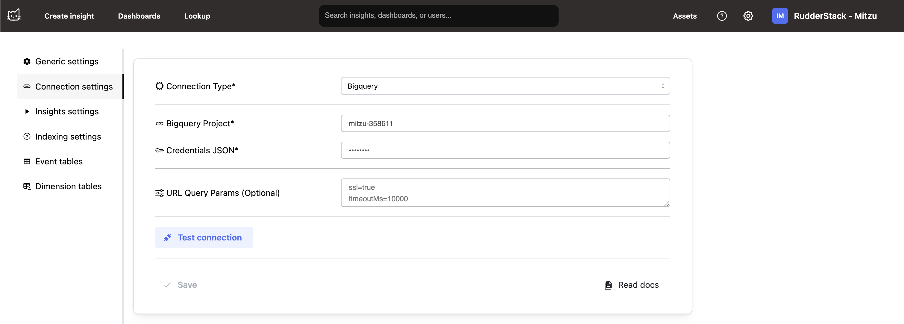 First, set up the connection to BigQuery from Mitzu. You can reuse the same service account created for RudderStack integration for simplicity.