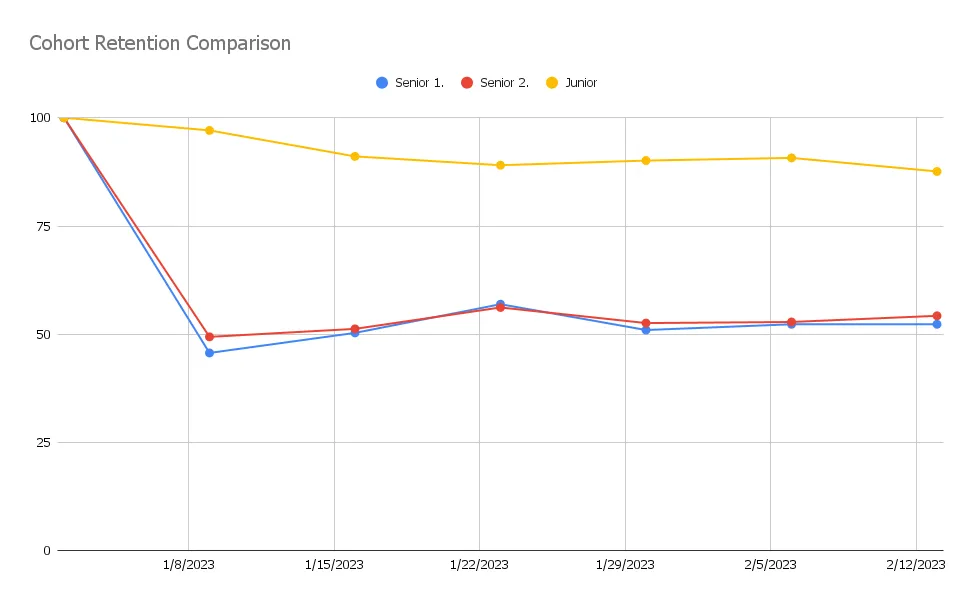 One of the main metrics the company wanted to track was cohort user retention. With that, we wanted to see what impact the application changes had on newly acquired users.
