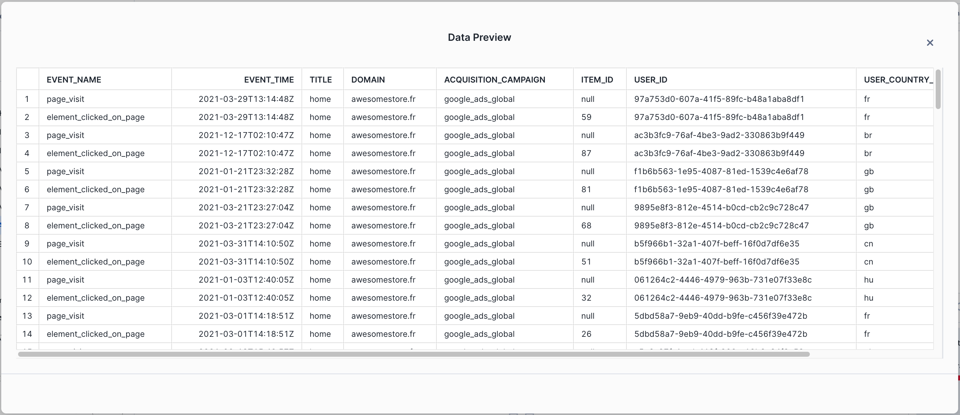 Notice that the table has country_code and item_id columns as foreign keys.In the fact table, we have two event types: