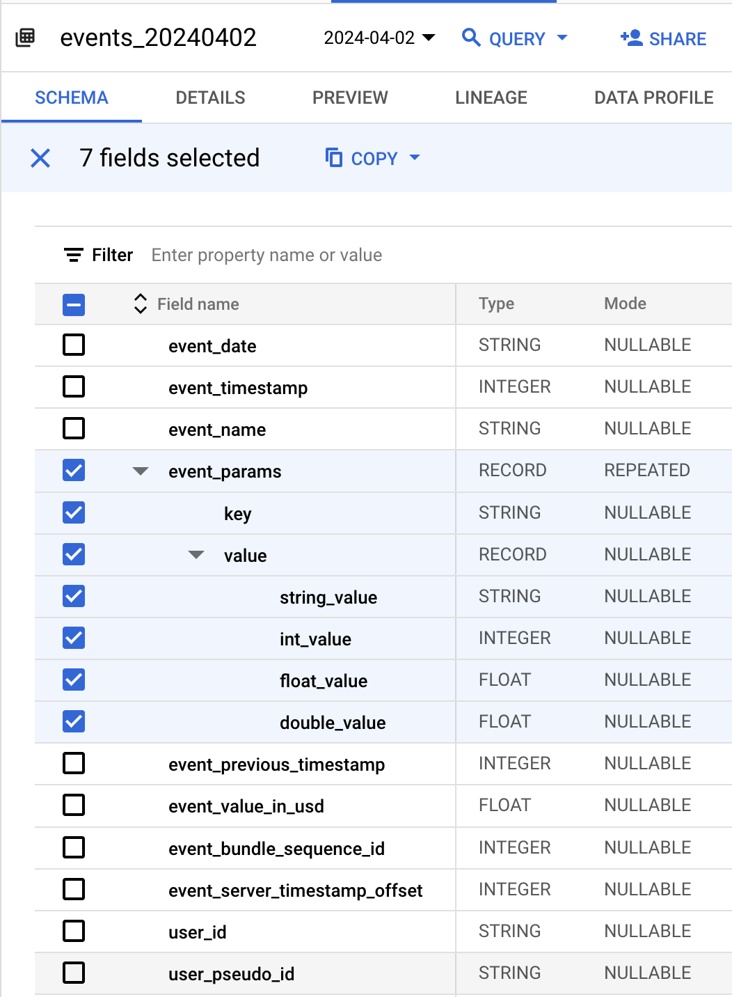 event_name = 'page_view'CREATE OR REPLACE TABLE `<project>.<dataset>.ga4_events` AS (